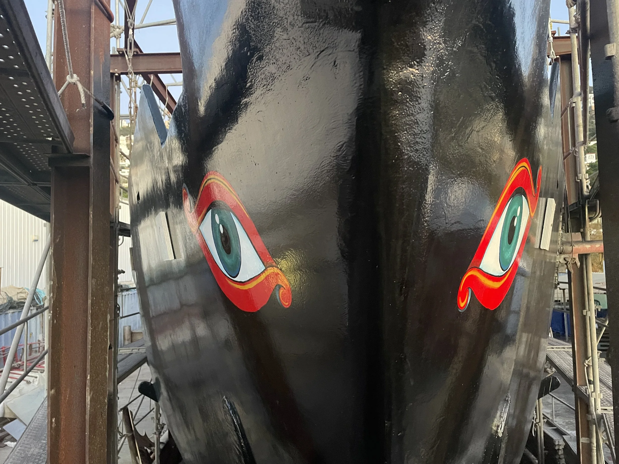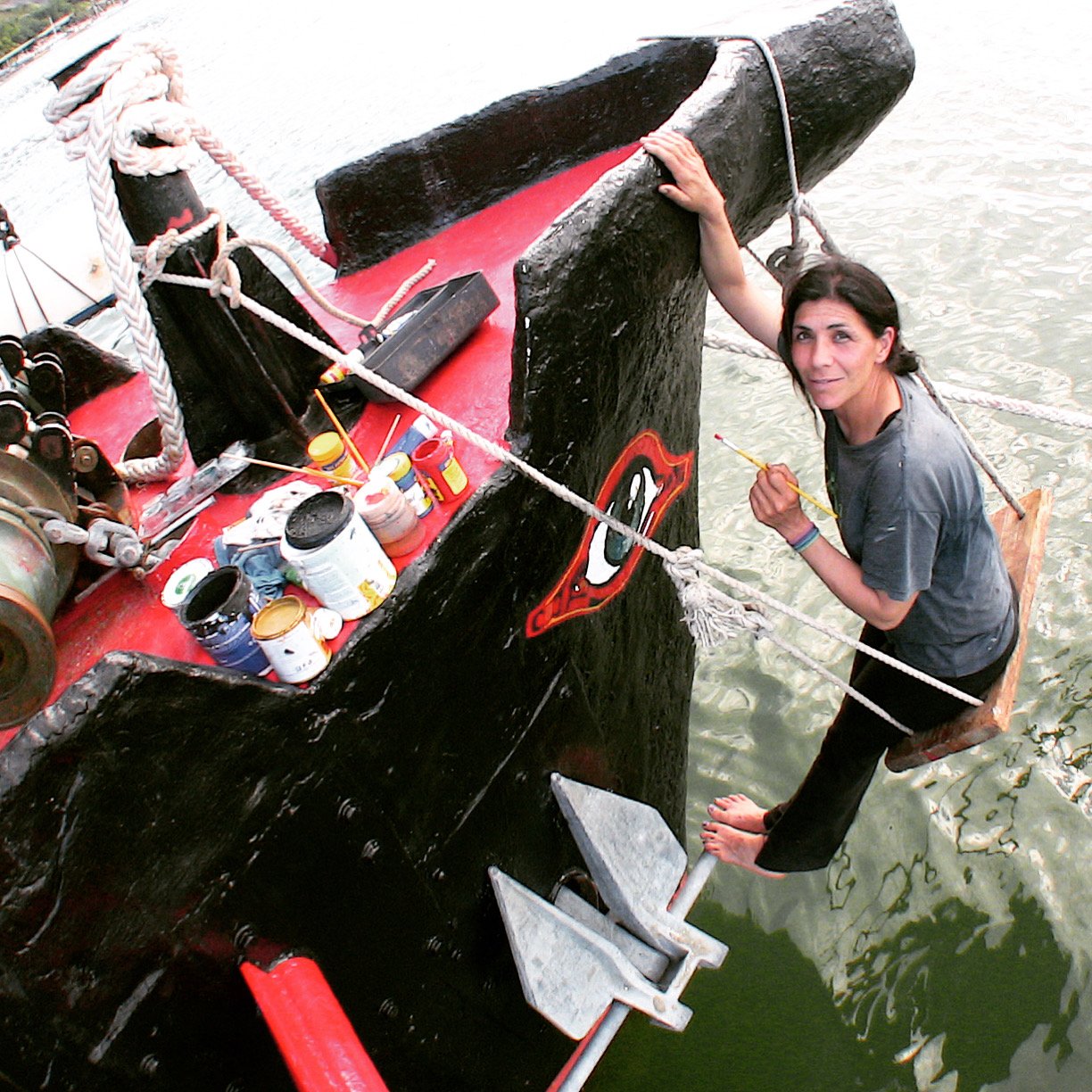 In the fall of 2025 the Mexican artist Corina del Carmel, who’s also sailed onboard in the Pacific and participated in the ship’s rebuild painted the Heraclitus eyes again, as many years earlier in California. The Ancient Greek ships were also adorned with eyes on their bows….as are the Asian junks after which the Heraclitus is modelled.