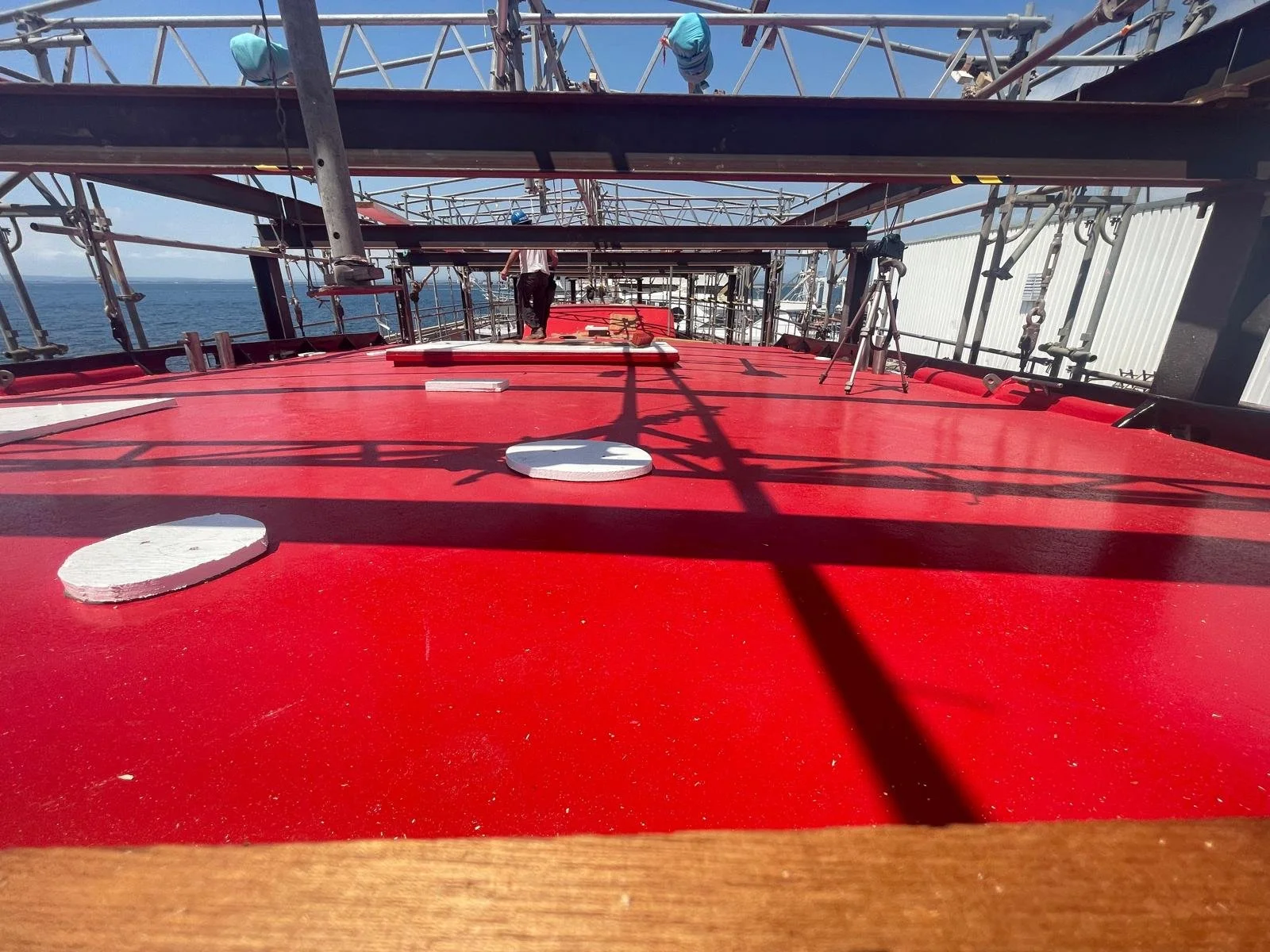 With the cocoon—an elaborate shed that sheltered the vessel during extensive structural work—finally dismantled, the Heraclitus now stands weatherproof and revitalized in black and red. A full coat of marine-grade paint, generously sponsored by Jotun Paints, now protects the hull and deck, offering both durability and a striking visual statement.